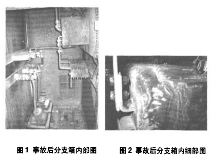 2007年7月18日某地輸配電線路產(chǎn)生跳閘,在巡線至石板坡一進四出電纜分支箱時,發(fā)現(xiàn)一進四出電纜分支箱兩端的開關(guān)柜俑壁產(chǎn)生嚴峻變形、601進線開關(guān)柜面板有飛弧、放電及炭黑等現(xiàn)象。外觀上,箱體內(nèi)水跡顯著。儀表柜門已銹死,不得不撬開,操作組織已無法滾動、只能將其解體后打開關(guān)柜門。打開#601開關(guān)柜電纜室發(fā)現(xiàn):計量TⅣV的熔斷器及支撐絕緣子兩相悉數(shù)炸碎、另一相熔斷器產(chǎn)生決裂,支撐絕緣子產(chǎn)生破損,AT外表有爬電痕跡,柜體多處存在放電痕跡,如圖1所示。打開相鄰間隔檢查,狀況相同嚴峻,導(dǎo)電部分受潮嚴峻,銅排及固定鏢栓已長鹵銹,TA外表有多處爬電痕跡,見圖2。該分支箱為某電器廠制作,2003年投運、僅3年多。