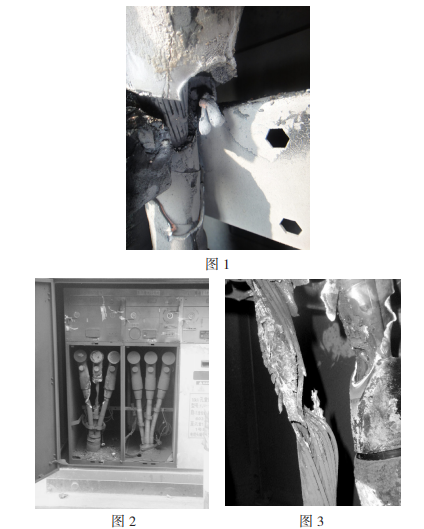 2009年2月15日,回南天,仙村站孔堂線在經(jīng)歷了長達(dá)18分鐘的間歇性接地后速斷跳閘,重合不成功,電纜分支箱601開關(guān)B相進(jìn)線電纜終端應(yīng)力錐處首先短路燒毀(如圖2)。據(jù)分支箱附近商鋪店主反映,箱內(nèi)曾繼續(xù)宣布嘩啪的響聲并冒煙,終究傳出爆炸聲音。經(jīng)開始剖析,事端原發(fā)點為B相應(yīng)力錐尾部,因為密封不嚴(yán),硅脂固化,在運轉(zhuǎn)環(huán)境濕度較大的情況下呈現(xiàn)凝露,水氣進(jìn)入纜芯,導(dǎo)致絕緣強(qiáng)度破壞產(chǎn)生爬電。終究由間歇性接地發(fā)展到三相短路(如圖3)。此次故障相同導(dǎo)致分支箱氣室破損泄漏,分支箱報廢。